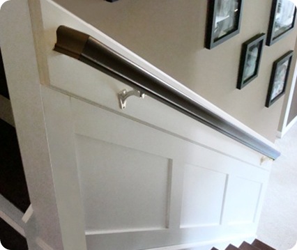 The handrail got a quick sanding, then two coats of brown paint, leftover from our dining room walls. I put a coat of poly on top and plan to add one more.