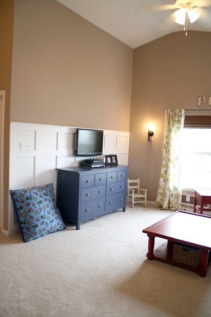Then I started simplifying things a bit. The toys moved downstairs, I took down the picture shelves and added some board and batten: