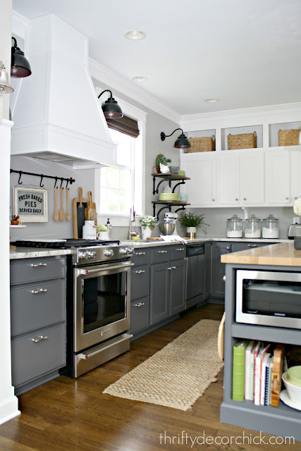 Keep in mind, this is very much in between. I have a lot to do -- install side panels on the cabinets, finish the baseboards on the wall and under the cabinets, paint the unfinished cabinets and then figure out what I'm going to do on the blank wall.